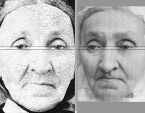In this case, preparing the photos ruled out a match. Here’s why: When the pupils were aligned horizontally and the irises were made the same size – in this case half-irises due to the heavy upper lids – it was extremely easy to see that this was not the same woman. Mary, on the left, has eyes that are smaller in proportion to her face. Susannah, on the right, has eyes that are larger in proportion to her face. So, in the end, this makes Mary’s head noticeably larger than Susannah’s.