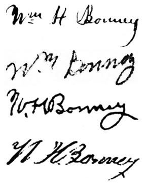 At left is an example of differences in signatures. These are four alleged signatues of William H. Bonney ("Billy the Kid"). They are his only known possible signatures. But is one authentic and the others forged? Maybe, maybe not. But none of them match each other. They each have significant differences, including the "n" connectors in the last name.