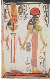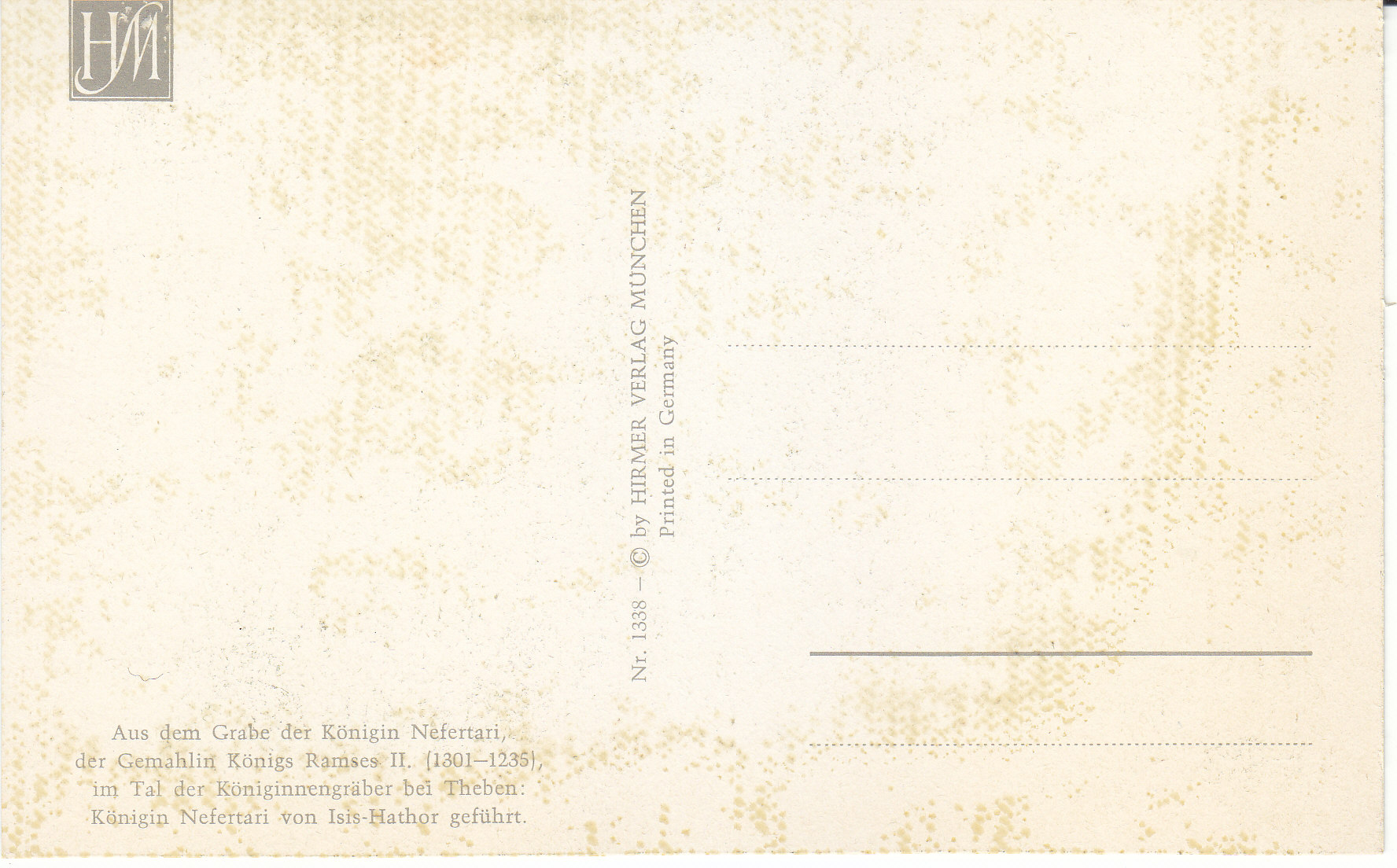 POSTCARD #076 Aus dem Grabe der Königin Nefertari der Gemahlin Königs Ramses II. (1301-1235), im Tal der Königinnengräber bei Theben: Königin Nefertari von Isis-Hathor geführt. [From the grave of Queen Nefertari, consort of King Ramses II (1301-1235), in the valley of the queen's tombs near Thebes: Queen Nefertari guided by Isis-Hathor]. Nr. 1338. © by Hirmer Verlag München [Munich, Germany]. Printed in Germany. 3.5" x 5.75" EXC