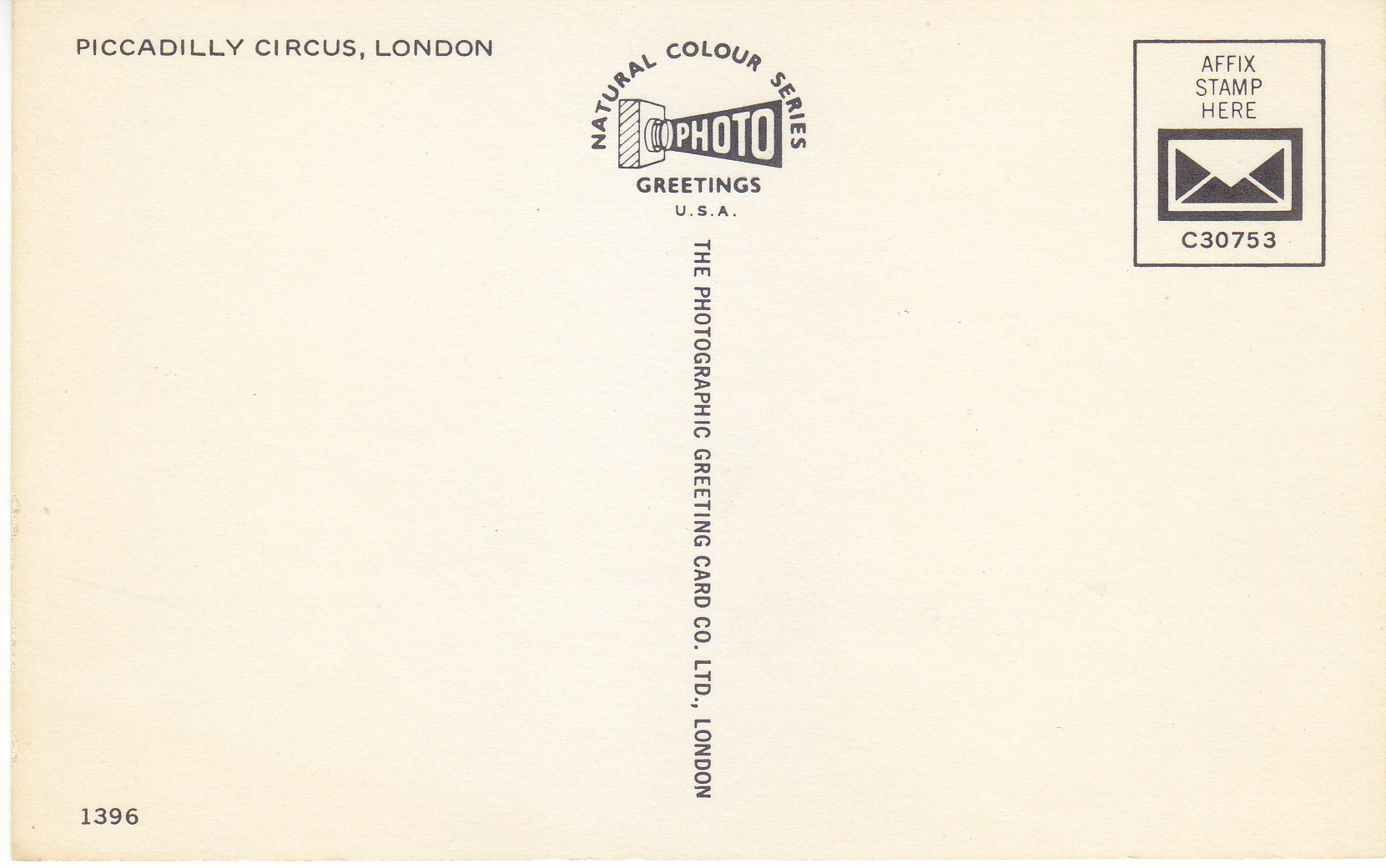 POSTCARD #098 Piccadilly Circus, London [England]. 1396. Natural Colour Series Photo Greetings, USA. C30753. The Photographic Greeting Card Co. Ltd., London [England]. 5.5" x 3.5" EXC