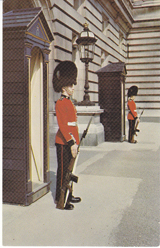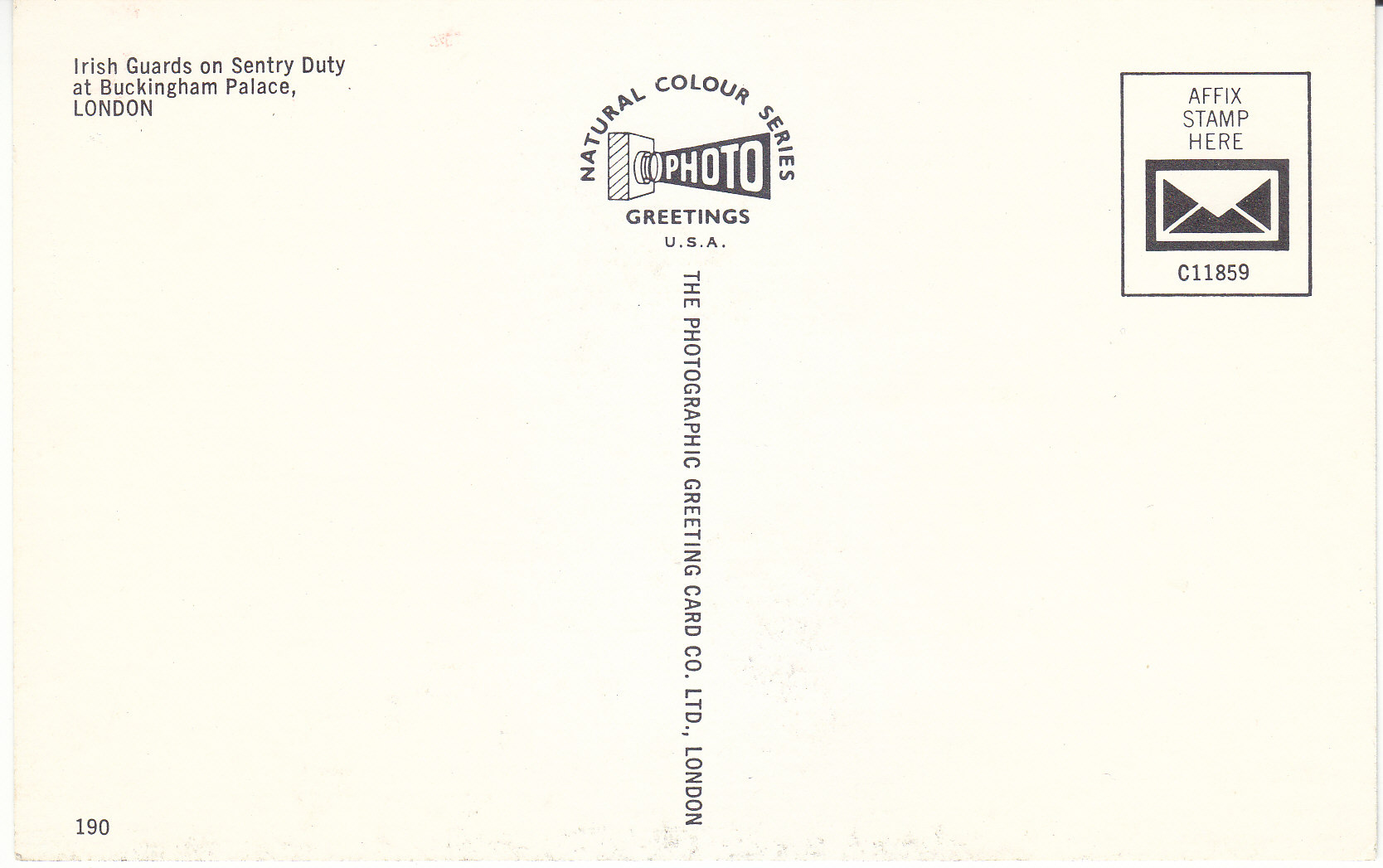 POSTCARD #099 Irish Guards on Sentry Duty at Buckingham Palace, London [England]. Piccadilly Circus, London [England]. 190. Natural Colour Series Photo Greetings, USA. C11859. The Photographic Greeting Card Co. Ltd., London [England]. 3.5" x 5.5" EXC