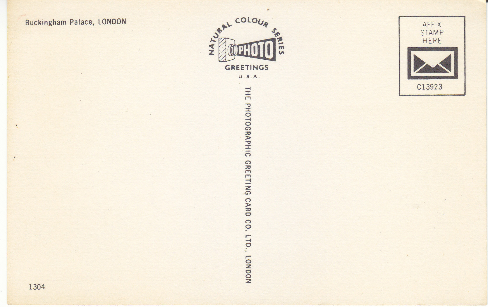 POSTCARD #100 Buckingham Palace, London [England]. 1304. Natural Colour Series Photo Greetings, USA. C13923. The Photographic Greeting Card Co. Ltd., London [England]. 5.5" x 3.5" EXC