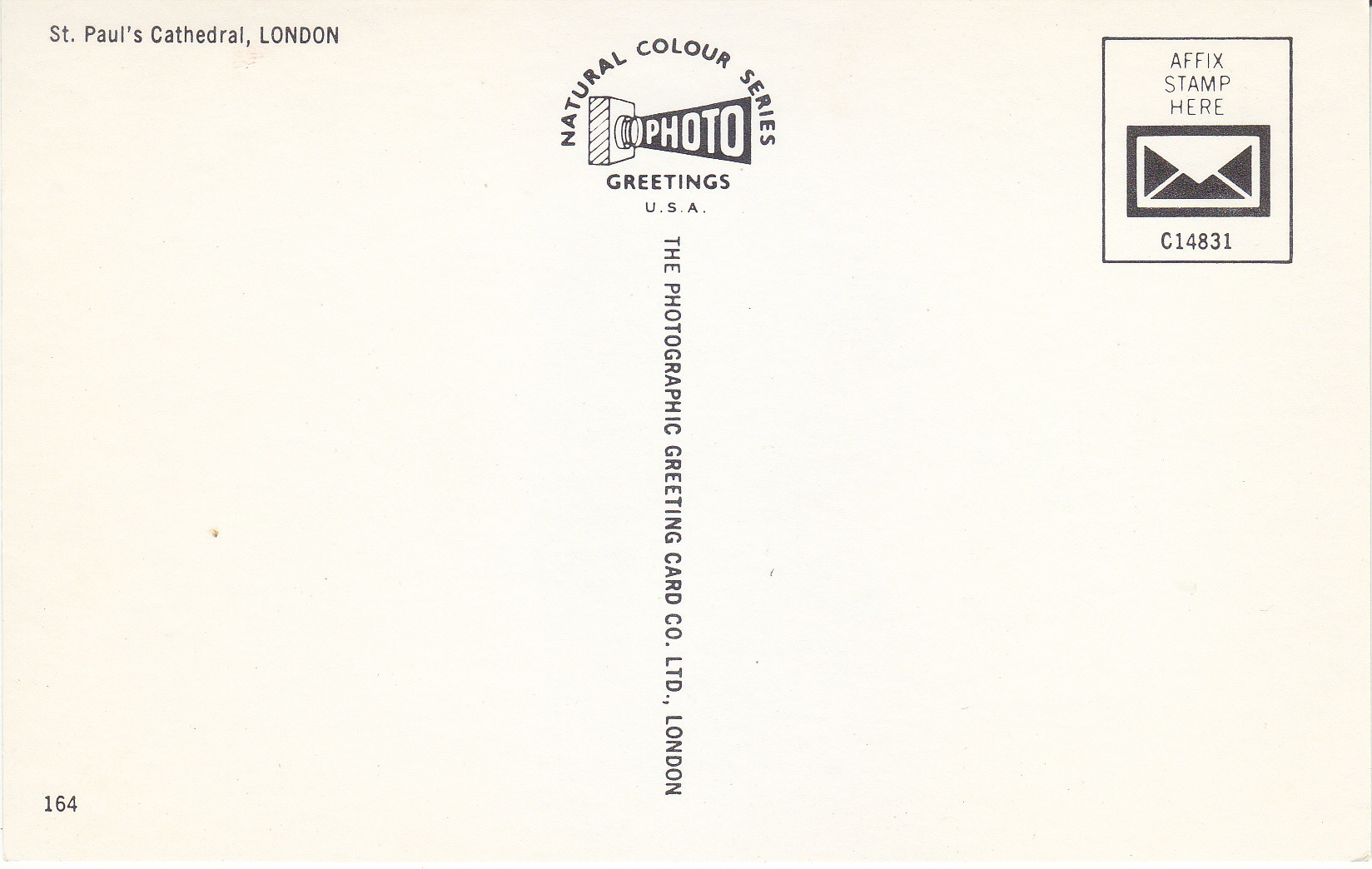 POSTCARD #101 St. Paul's Cathedral, London [England]. 164. Natural Colour Series Photo Greetings, USA. C14831. The Photographic Greeting Card Co. Ltd., London [England]. 3.5" x 5.5" EXC