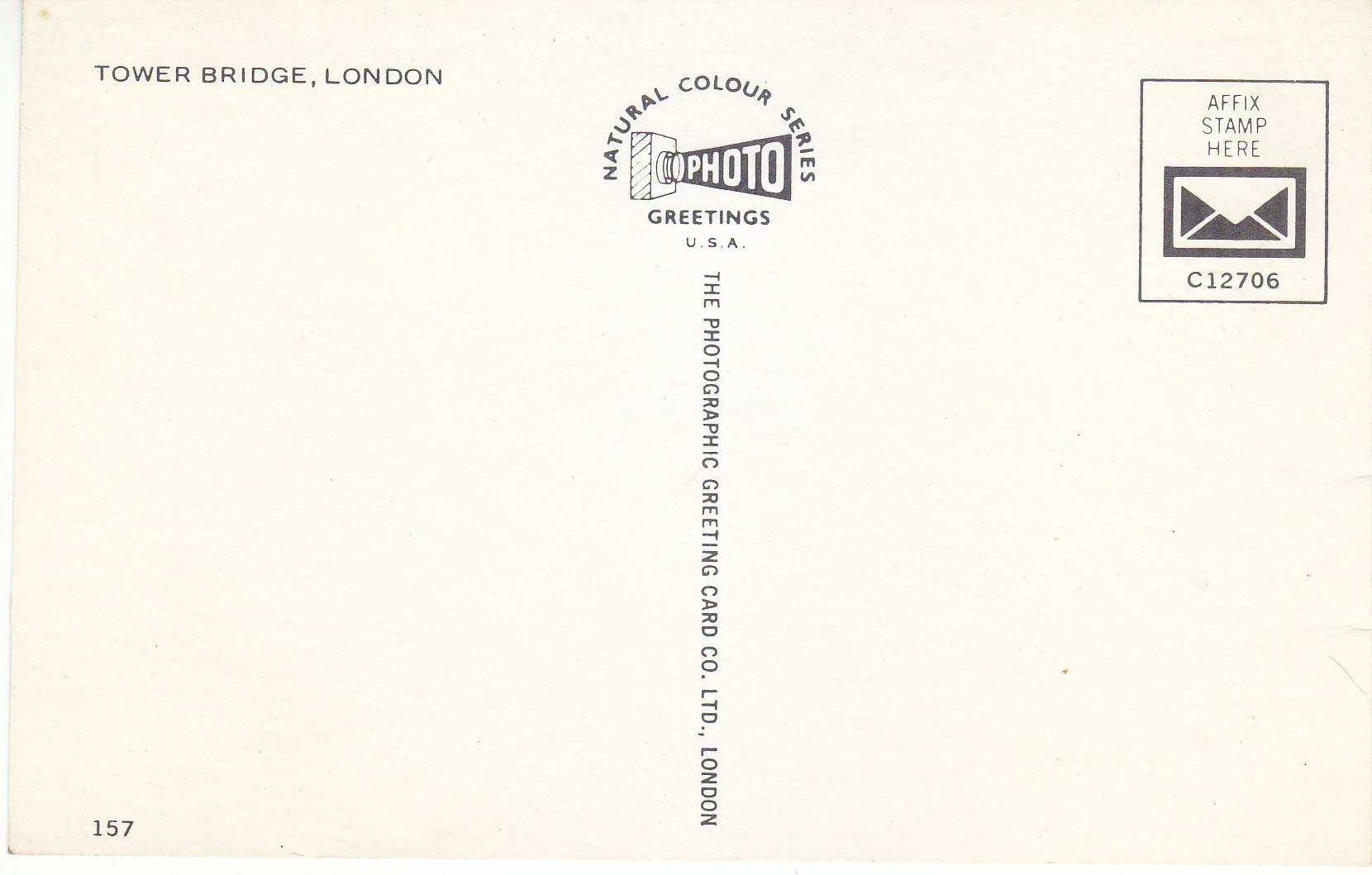 POSTCARD #102 Tower Bridge, London [England]. 157. Natural Colour Series Photo Greetings, USA. C12706. The Photographic Greeting Card Co. Ltd., London [England]. 5.5" x 3.5" EXC