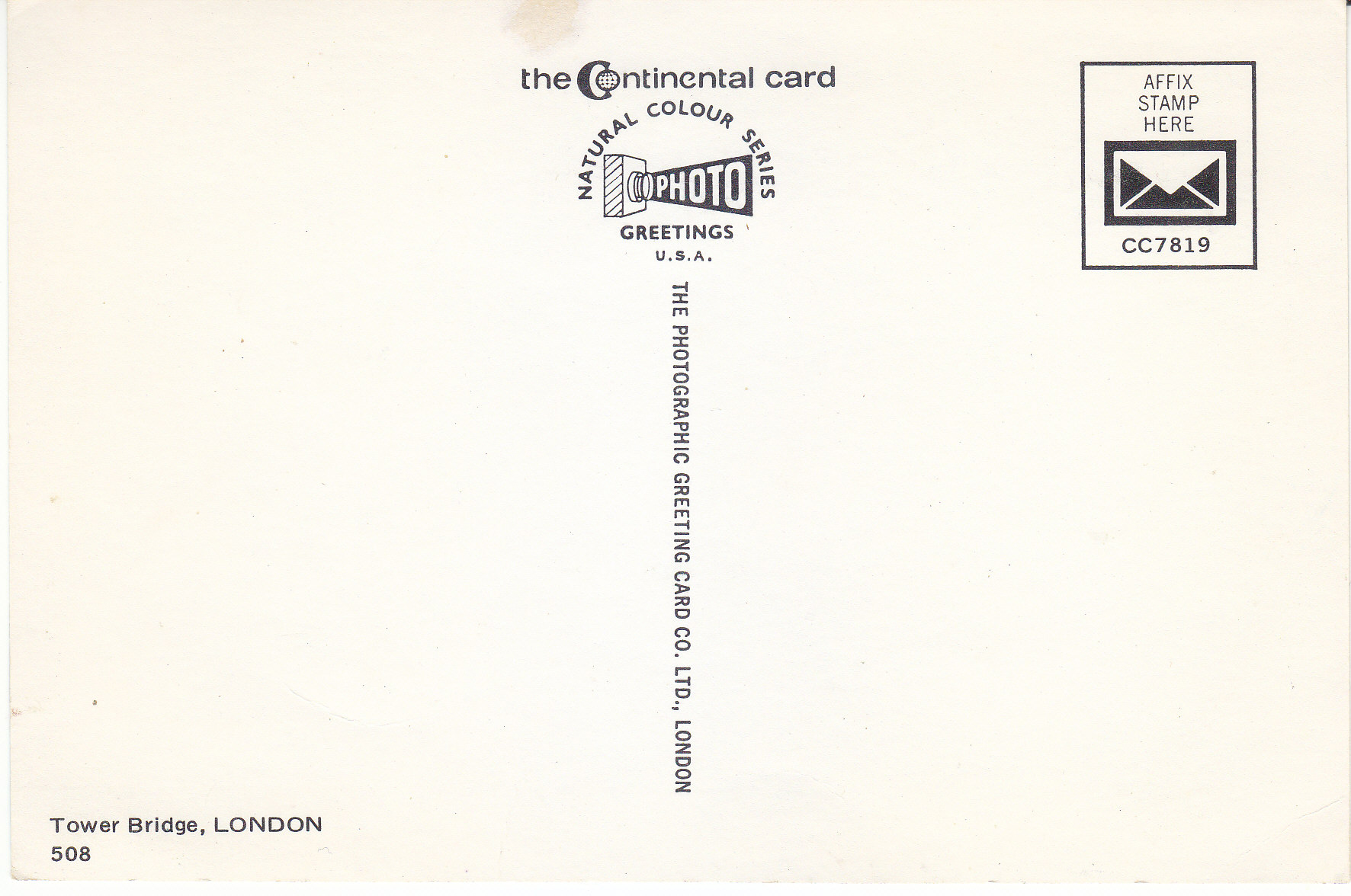 POSTCARD #103 Tower Bridge, London [England]. 508. The Continental Card. Natural Colour Series Photo Greetings, USA. CC7819. The Photographic Greeting Card Co. Ltd., London [England]. 5.75" x 3.75" VG