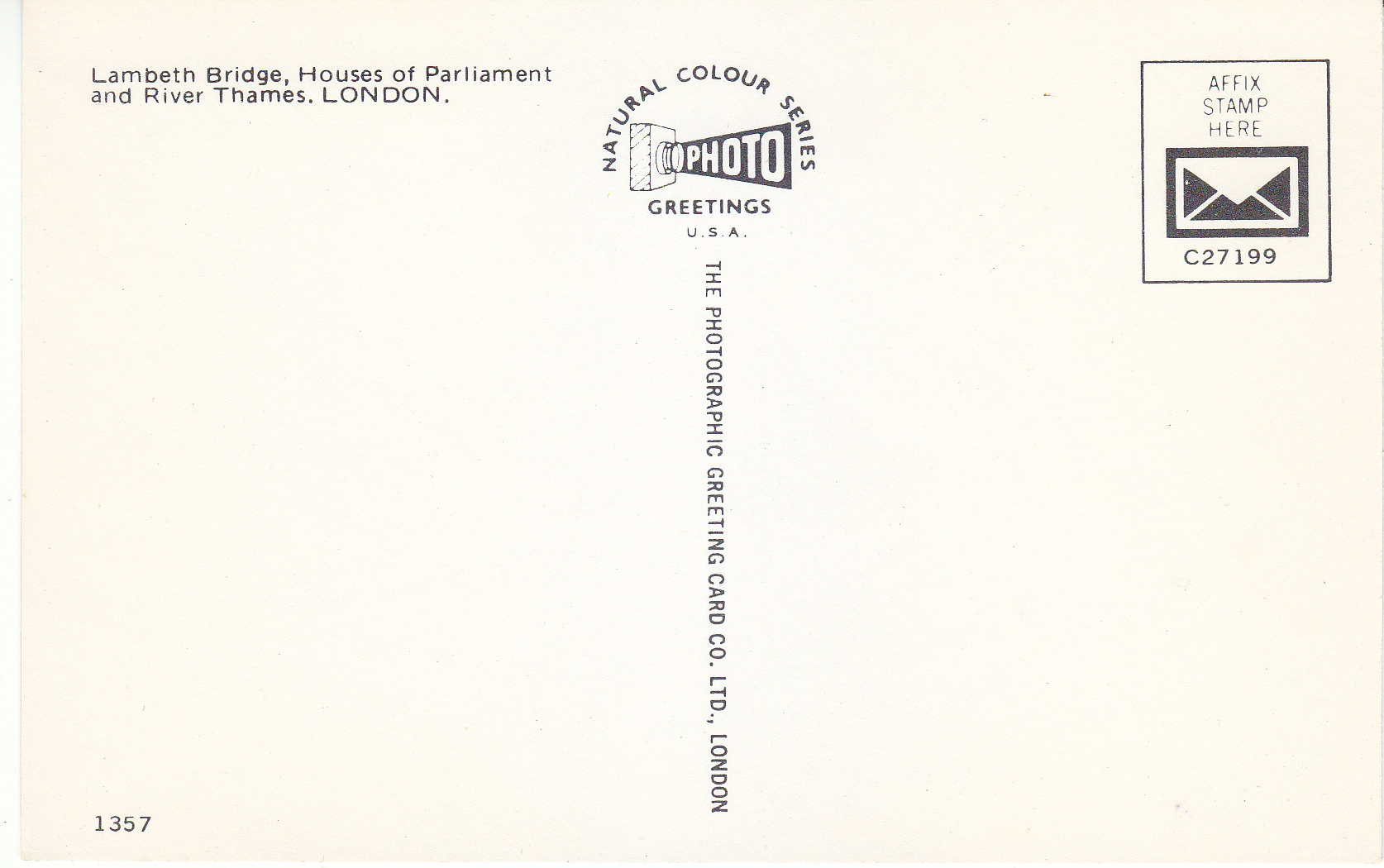 POSTCARD #104 Lambeth Bridge, Houses of Parliament and River Thames, London [England]. 1357. Natural Colour Series Photo Greetings, USA. C27199. The Photographic Greeting Card Co. Ltd., London [England]. 5.75" x 3.75" VG