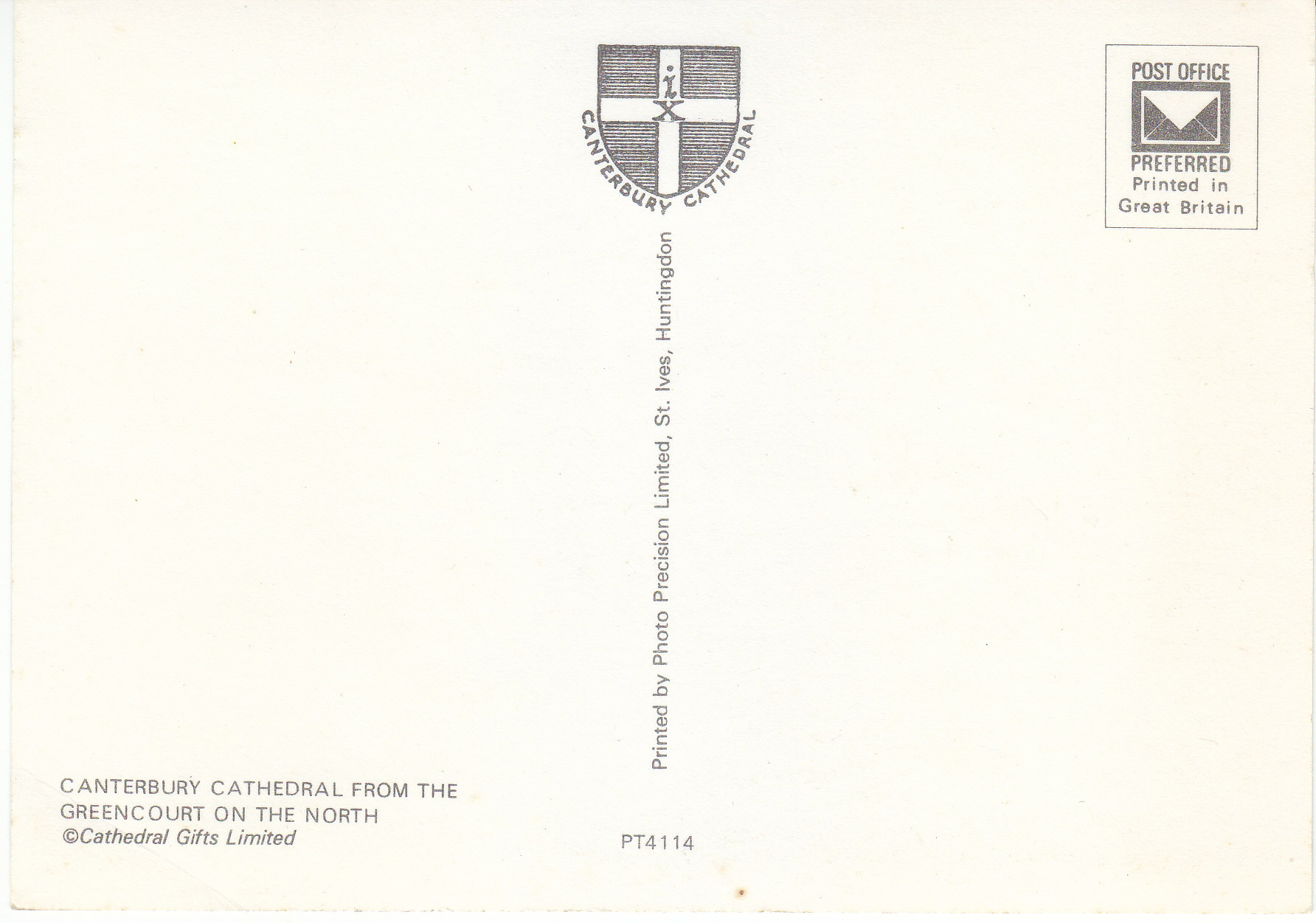 POSTCARD #135 Canterbury Cathedral [Canterbury, England]. View from the Greencourt on the North. Copyright Cathedral Gifts Limited. PT4114. Printed by Photo Precision Limited, St. Ives, Huntingdon [England]. 6" x 4" EXC