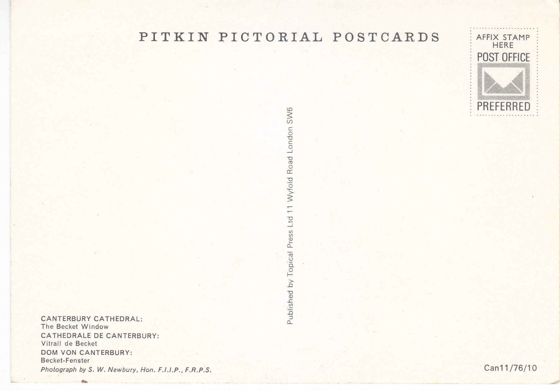 POSTCARD #137 Becket Window, Canterbury Cathedral [Canterbury, England]. Photograph by S.W. Newbury, Hon. F.I.I.P., F.R.P.S. Can11/76/10. Pitkin Pictorial Postcards. Published by Topical Press Ltd. 11 Wyfold Road, London [England] SW6. 6" x 4" EXC