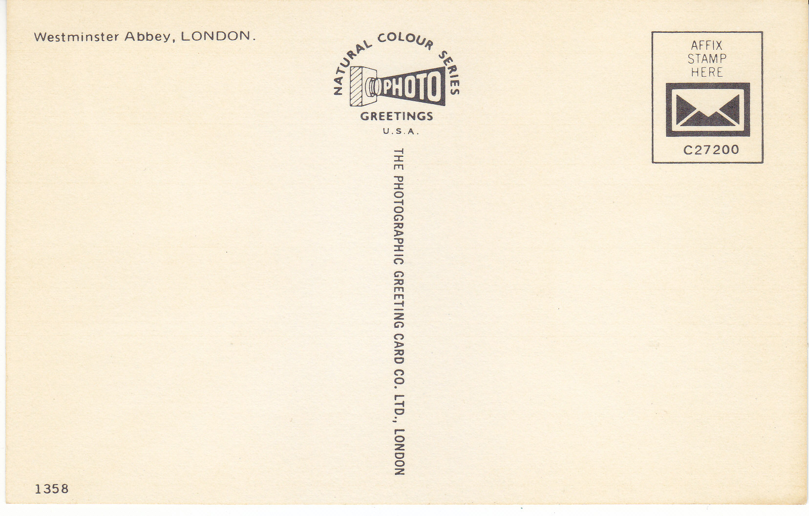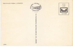 POSTCARD #140 Westminster Abbey, London [England]. Natural Colour Series Photo Greetings U.S.A. C27200. 1358. The Photographic Greeting Card Co. Ltd., London [England]. 6" x 4" EXC