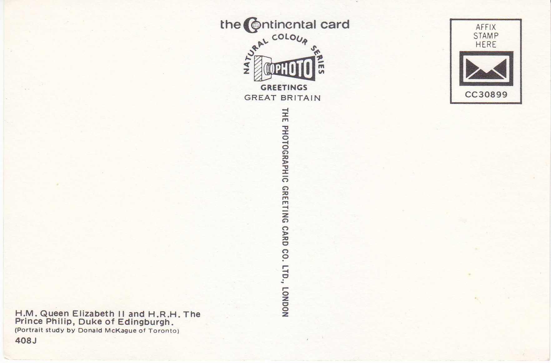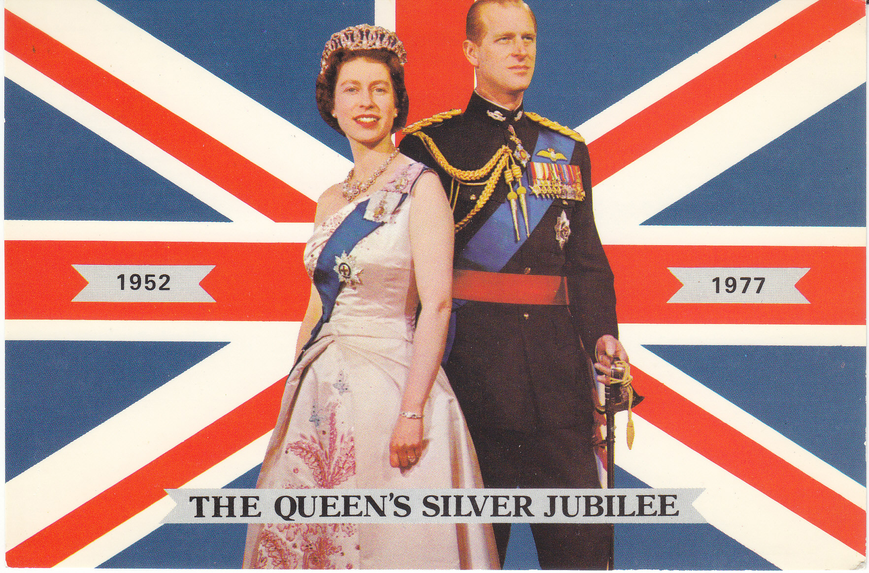 POSTCARD #141 The Queen's Silver Jubilee. 1952-1977. H.M. Queen Elizabeth II and H.R.H. The Prince Philip, Duke of Edinburgh. (Portrait study by Donald McKaque of Toronto). 408J. The Continental Card. Natural Colour Series Photo Greetings, Great Britain. CC30899. The Photographic Greeting Card Co. Ltd., London [England]. 6" x 4" EXC