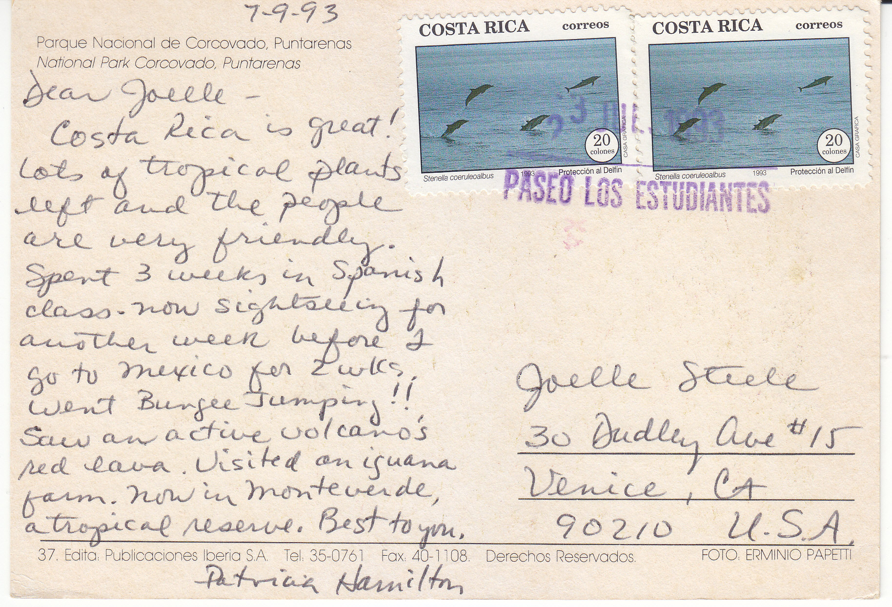 POSTCARD #146 National Park Corcovado, Puntarenas, Costa Rica. 37. Edita, Publicacciones Iberia S.A. Tel. 35-0761 Fax 40-1108. Derechos Reservados. Foto, Ermino Papetti. 6" x 4" VG