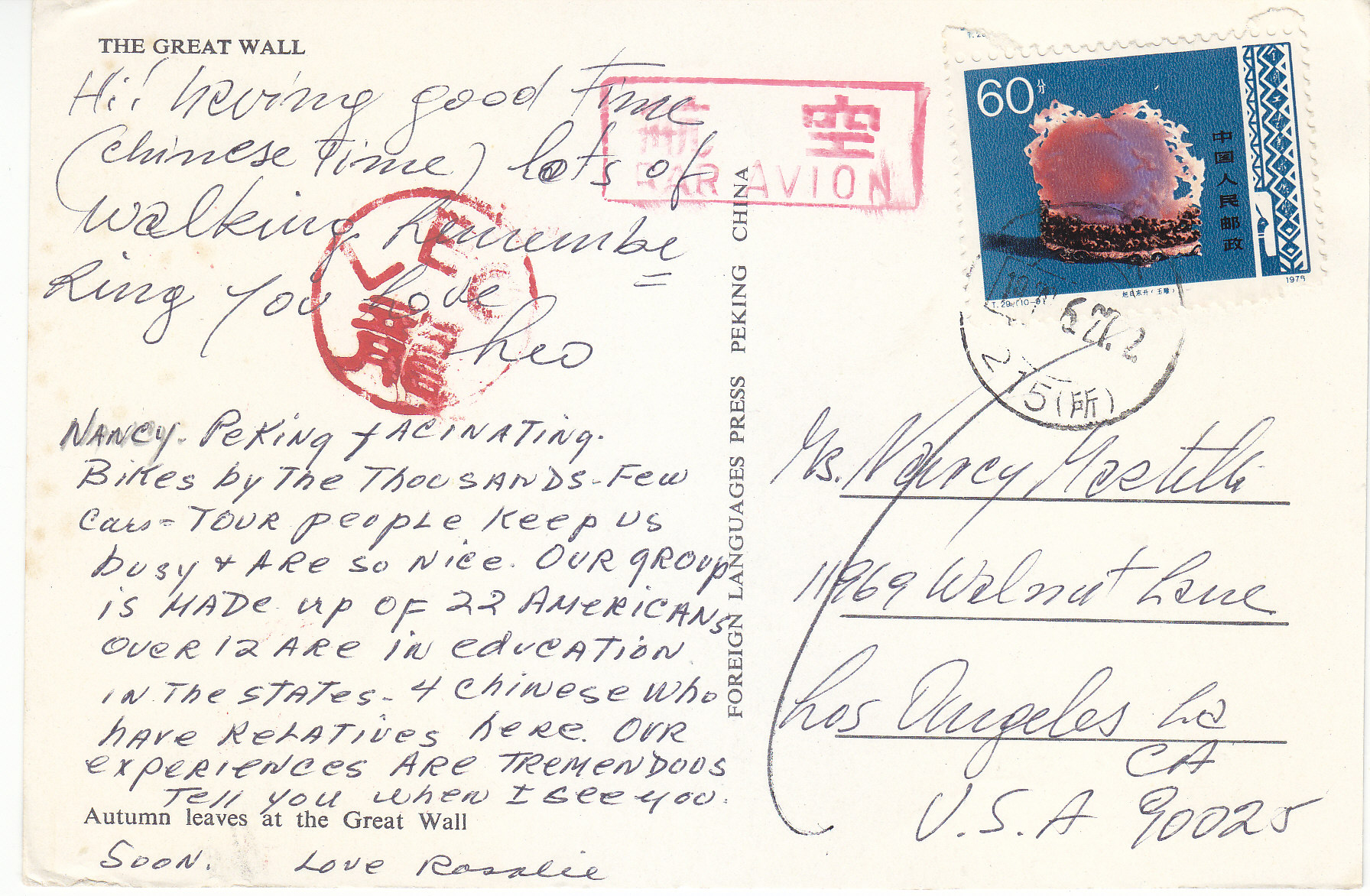 POSTCARD #148 The Great Wall. Autumn leaves at the Great Wall. Foreign Languages Press, Peking, China. 5.75" x 4" VG