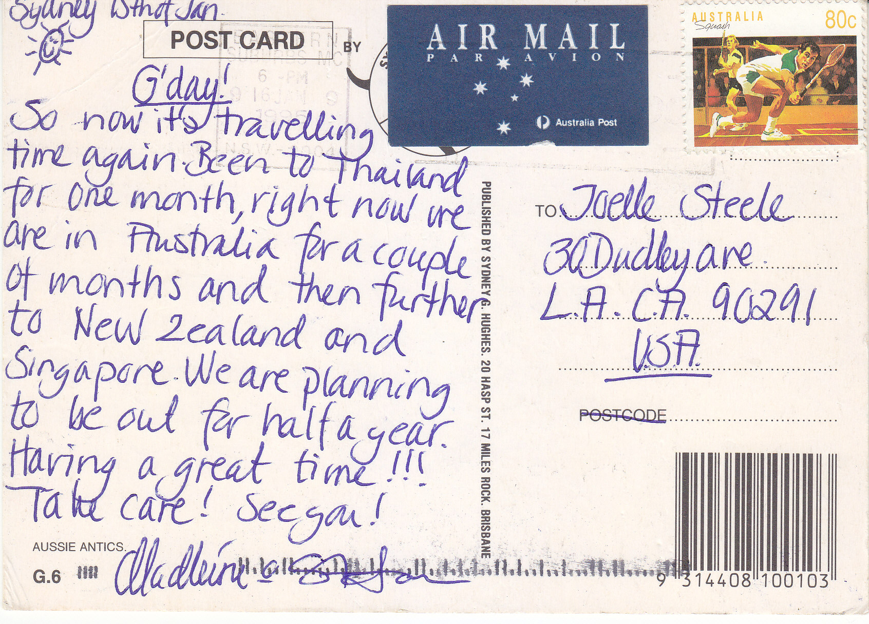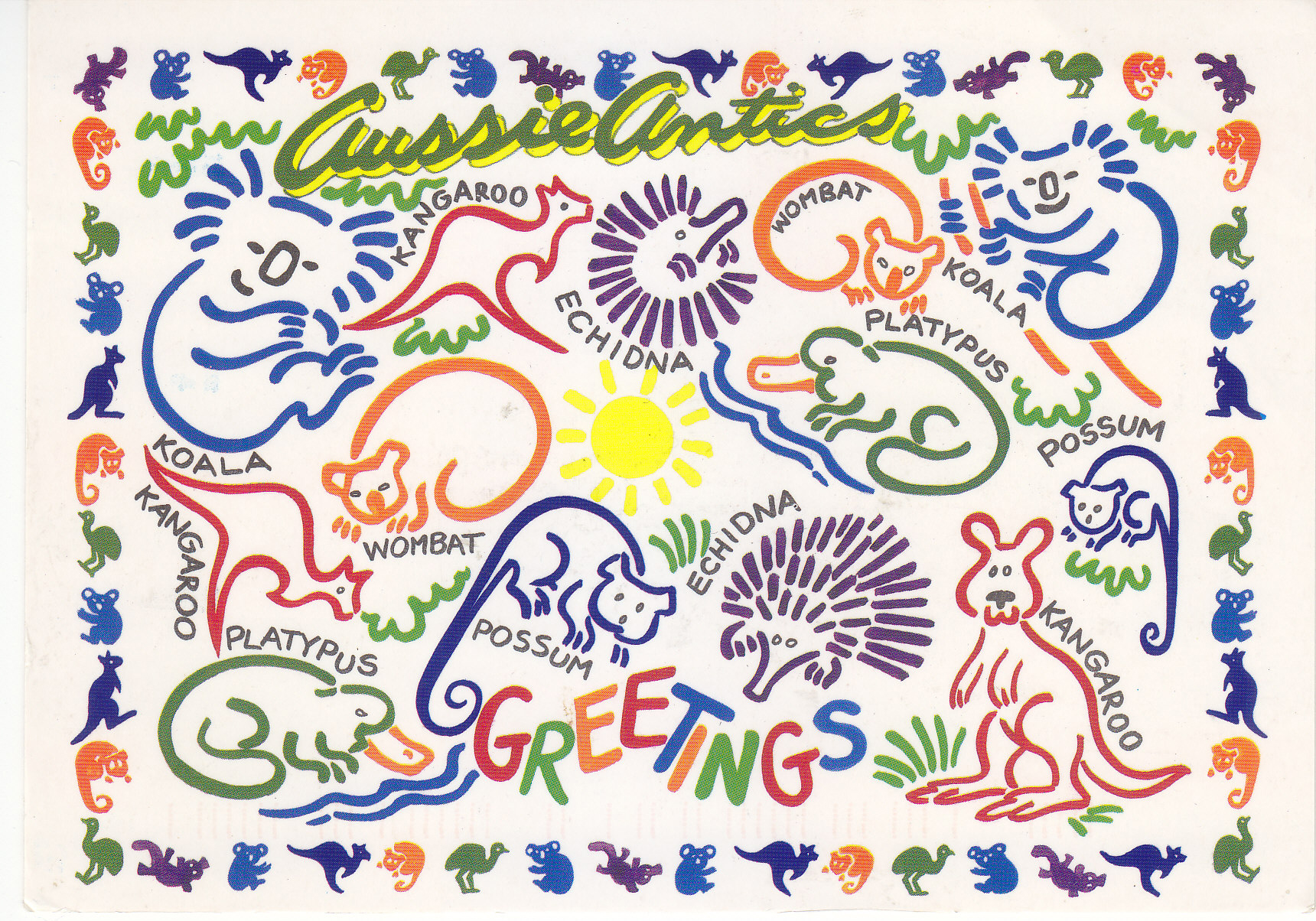 POSTCARD #150 Aussie Antics. Greetings. G.6 [Australia]. Published by Sydney G. Hughes, 20 Hasp St., 17 Miles Rock, Brisbane [Australia]. [Some printing covered by stamps.] 5.5" x 4" VG