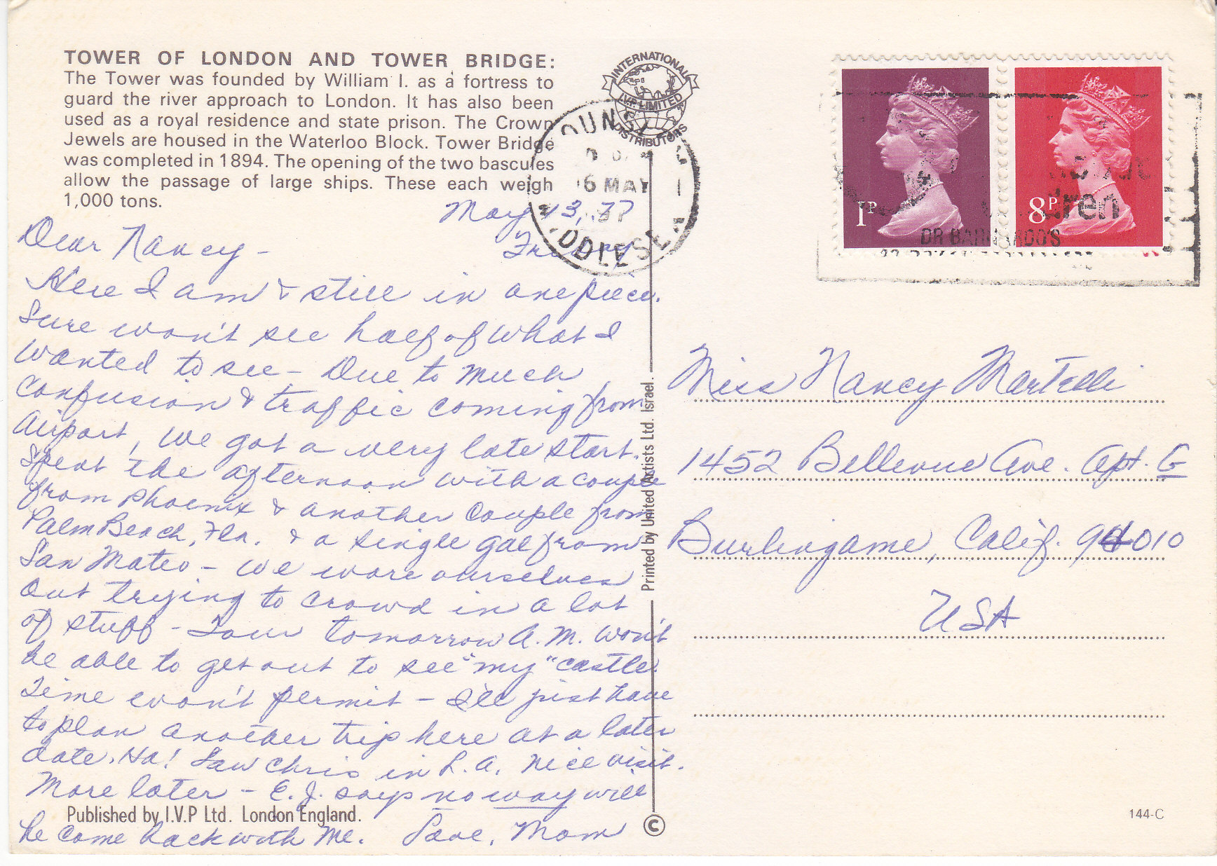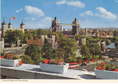 POSTCARD #274 Tower of London and Tower Bridge, London [England]. 144-C. The Tower was founded by William I as a fortress to guard the river approach to London. It has also been used as a royal residence and state prison. The Crown Jewels are housed in the Waterloo Block. Tower Bridge was completed in 1894. The opening of the two bascules allows the passage of large ships. These each weigh 1,000 tons. Published by I.V.P. Ltd. London, England. Printed by United Artists, Ltd., Israel. 5.75" x 4" VG