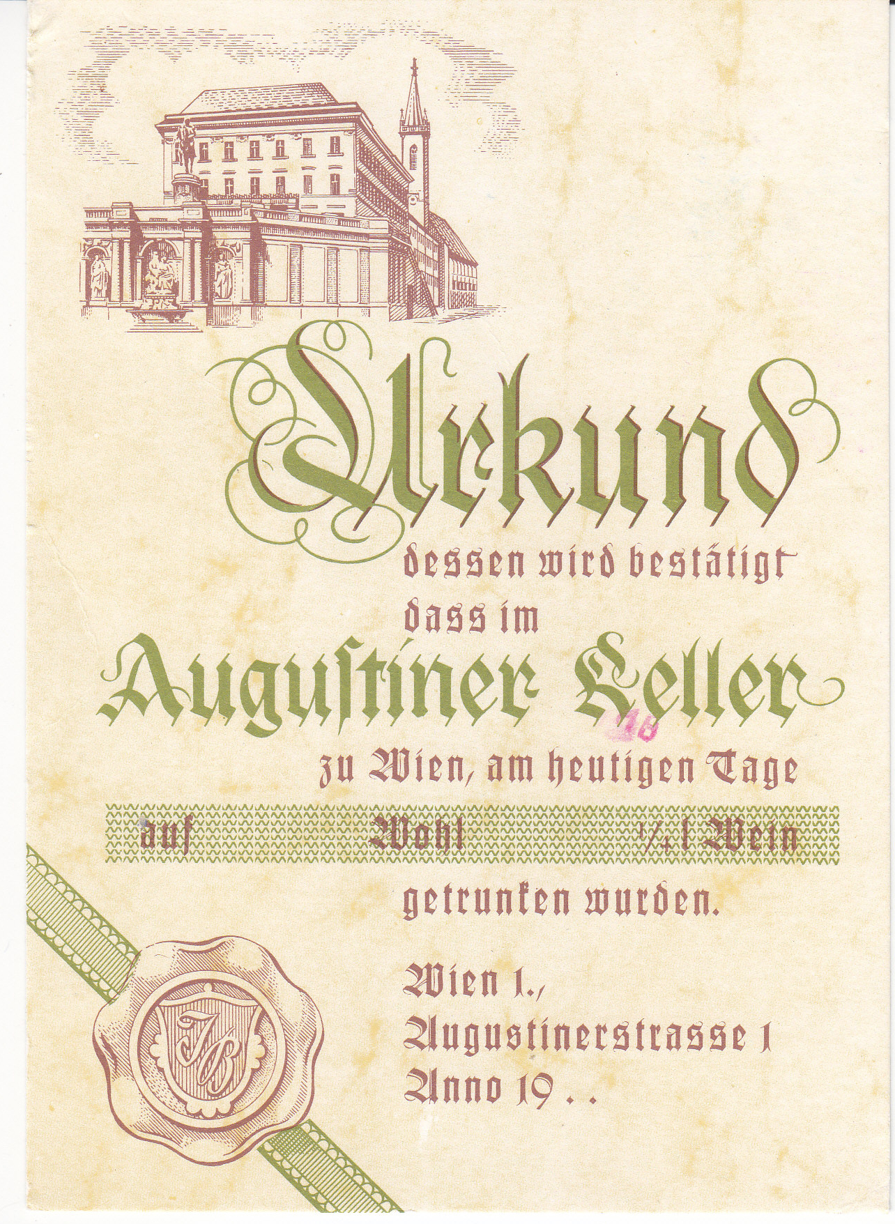POSTCARD #279 Vienna [Austria]. Slrkund dessen wird bestätigt dass im Augustiner Keller zu Wien am heutigen Tage auf Wohl getrunten wurden. Wien 1. Yugustinerstrassse 1, Unno 19. [Hard to translate because of the ornate writing, but it appears to be "It is confirmed that in the Augustiner cellar in Vienna today people were drinking. Vienna 1. Yugustinerstrasse 1, Unno 19.] Der Stadtheurige bei der Wiener Oper. Ganztagig geoffnet, kein Ruhetag, ab 18.30 Uhr Schrammelmusik. Spitzenweing, von 10-23 Uhr warme Speisen. Tel. 0222/52 17 46, 34 42 96. 5.75" x 4" GD