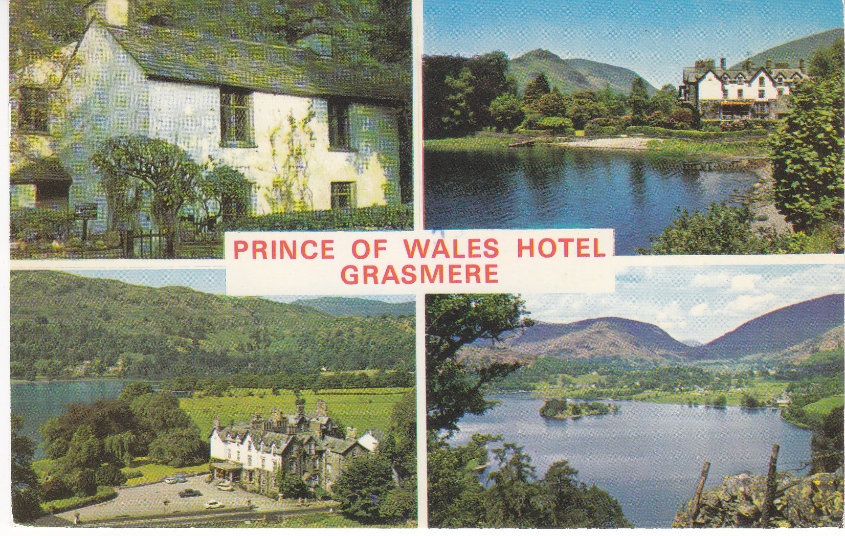 POSTCARD #289 Prince of Wales Hotel, Grasmere [Cumbria, England]. KLD 422. Top left: Dove Cottage, Grasmere; Top right: Prince of Wales Hotel; Bottom left: Prince of Wales Hotel; Bottom right: Grasmere Lake. Photographed and distributed by Sanderson & Dixon, Ambleside [Cumbria, England]. Printed by Jarrold & Sons Ltd, Norwich [England]. 5.5" x 3.5" VG