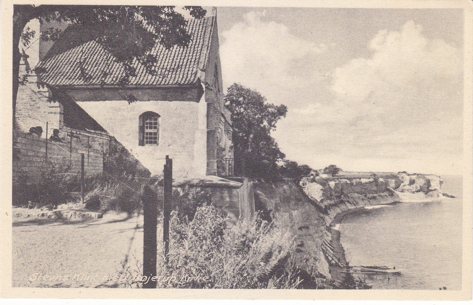 POSTCARD #353 Stevns Klint [a cliff] med Højerup [parish] Kirke [church] [Denmark]. Rudolf Olsen. Kunstforlag. Eneret Nr. 5582. 5.5" x 3.5" EXC