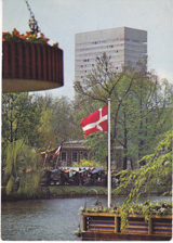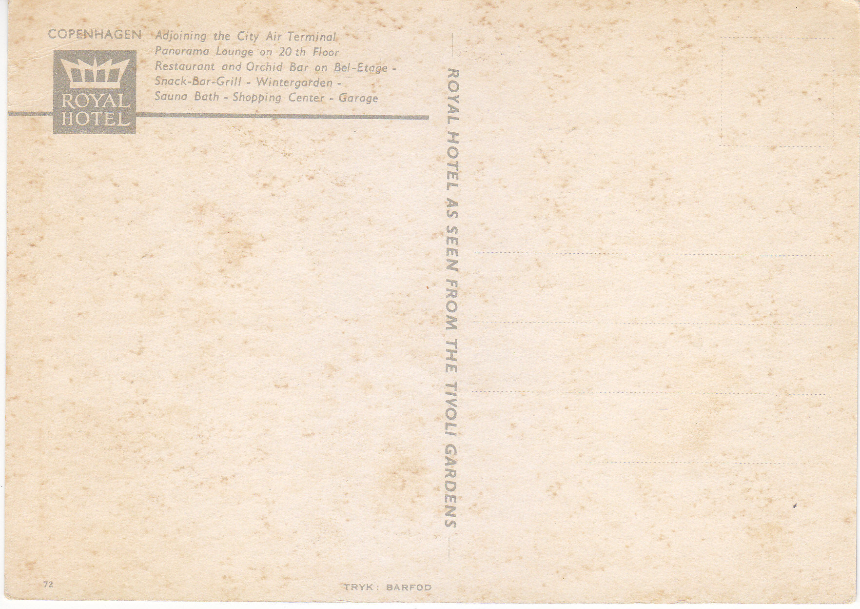 POSTCARD #356 Royal Hotel As Seen From The Tivoli Gardens [Copenhagen, Denmark]. 72. Copenhagen Royal Hotel, Adjoining the City Air Terminal. Panorama Lounge on 20th Floor. Restaurant and Orchid Bar on Bel-Etage. Snack-Bar-Grill-Wintergarden. Sauna Bath. Shopping Center. Garage. TRYK Barfod. 4" x 5.75" VG