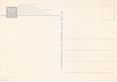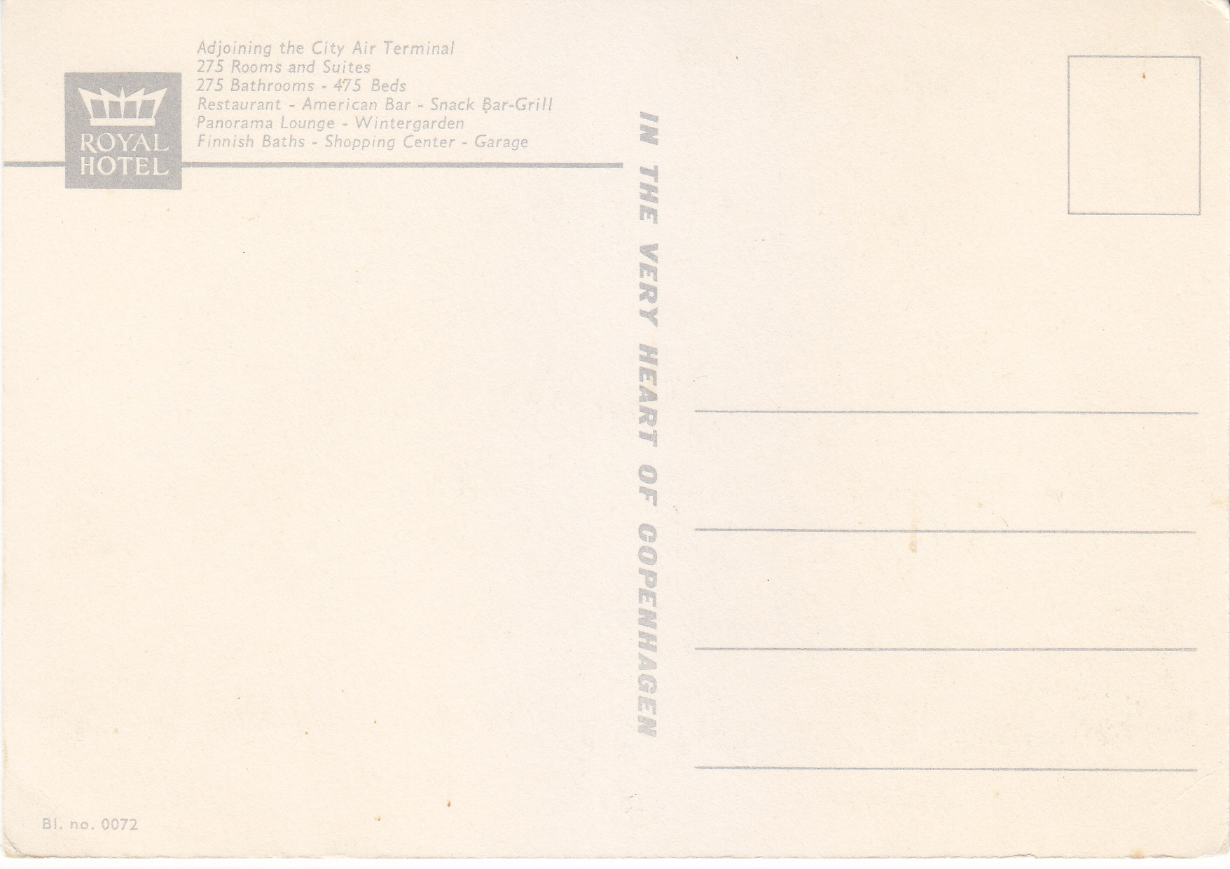 POSTCARD #357 In The Very Heart of Copenhagen. Royal Hotel [Copenhagen, Denmark]. Bl. no. 0072. Royal Hotel, Adjoining the City Air Terminal. 275 Rooms and Suites. 275 Bathrooms. 475 Beds. Restaurant. American Bar. Snack Bar-Grill. Panorama Lounge-Wintergarden. Finnish Baths. Shopping Center. Garage. 4" x 5.75" VG
