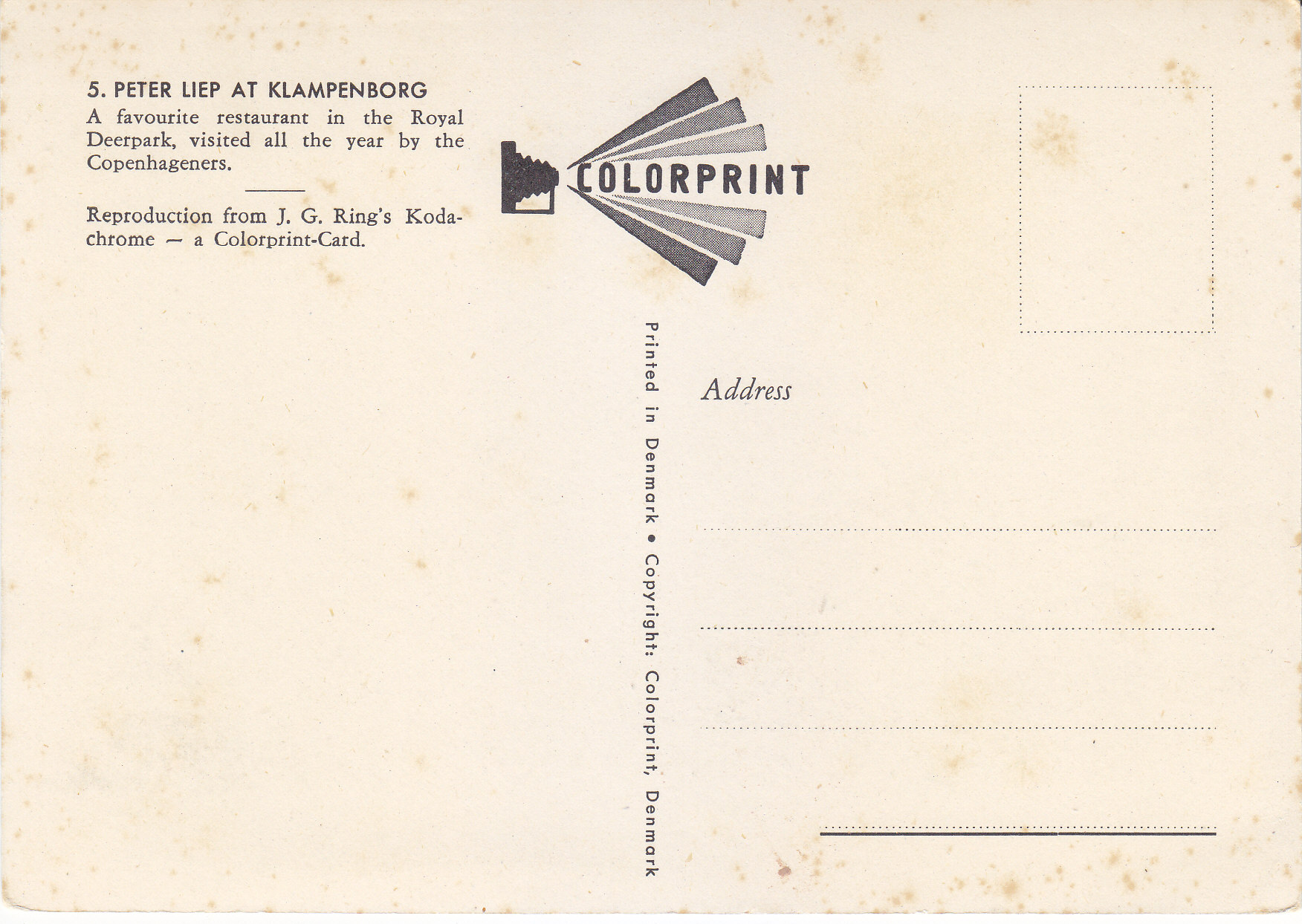 POSTCARD #360 Peter Liep at Klampenborg. 5. A favourite restaurant in the Royal Deerpark, visited all the year by the Copenhageners. Reproduction from J.G. Ring's Kodachrome - a Colorprint Card. Printed in Denmark. Copyright: Colorprint, Denmark. 5.75" x 4" VG
