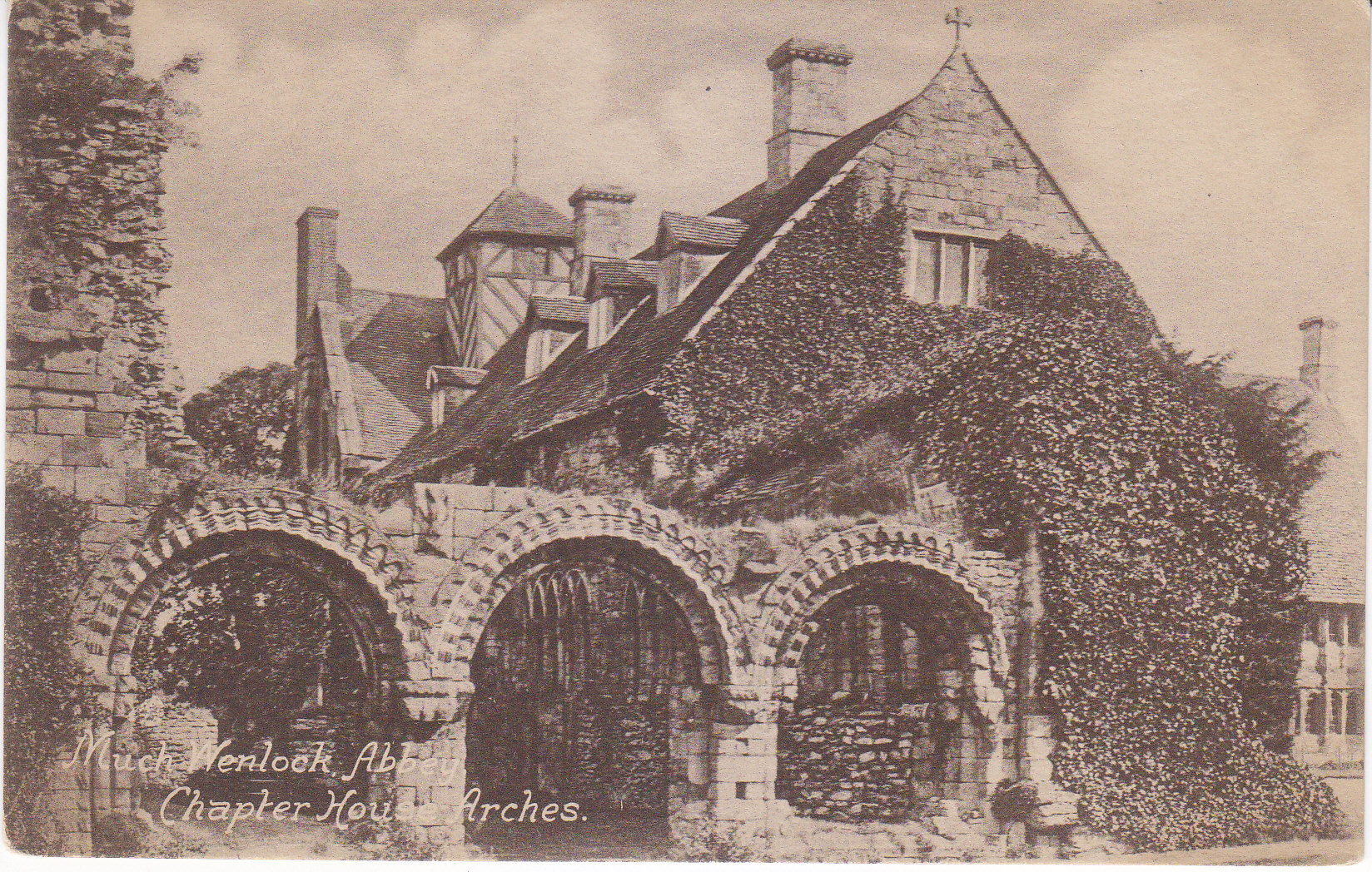 POSTCARD #411 Chapter House Arches, Much Wenlock Abbey [Wenlock Priory/St. Milburga's Priory, Much Wenlock, Shropshire, England]. F. Frith & Co. Ltd. Reigate [Surrey, England]. No. 30879. Frith's Series. Printed in England. 5.5" x 3.5" VG