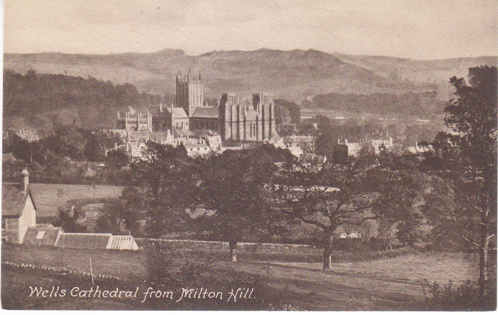 POSTCARD #414 View from Milton Hill, Wells Cathedral [Wells, Somerset, England]. F. Frith & Co. Ltd. Reigate [Surrey, England]. No. 1052B. Frith's Series. Printed in England. 5.5" x 3.5" EXC