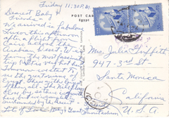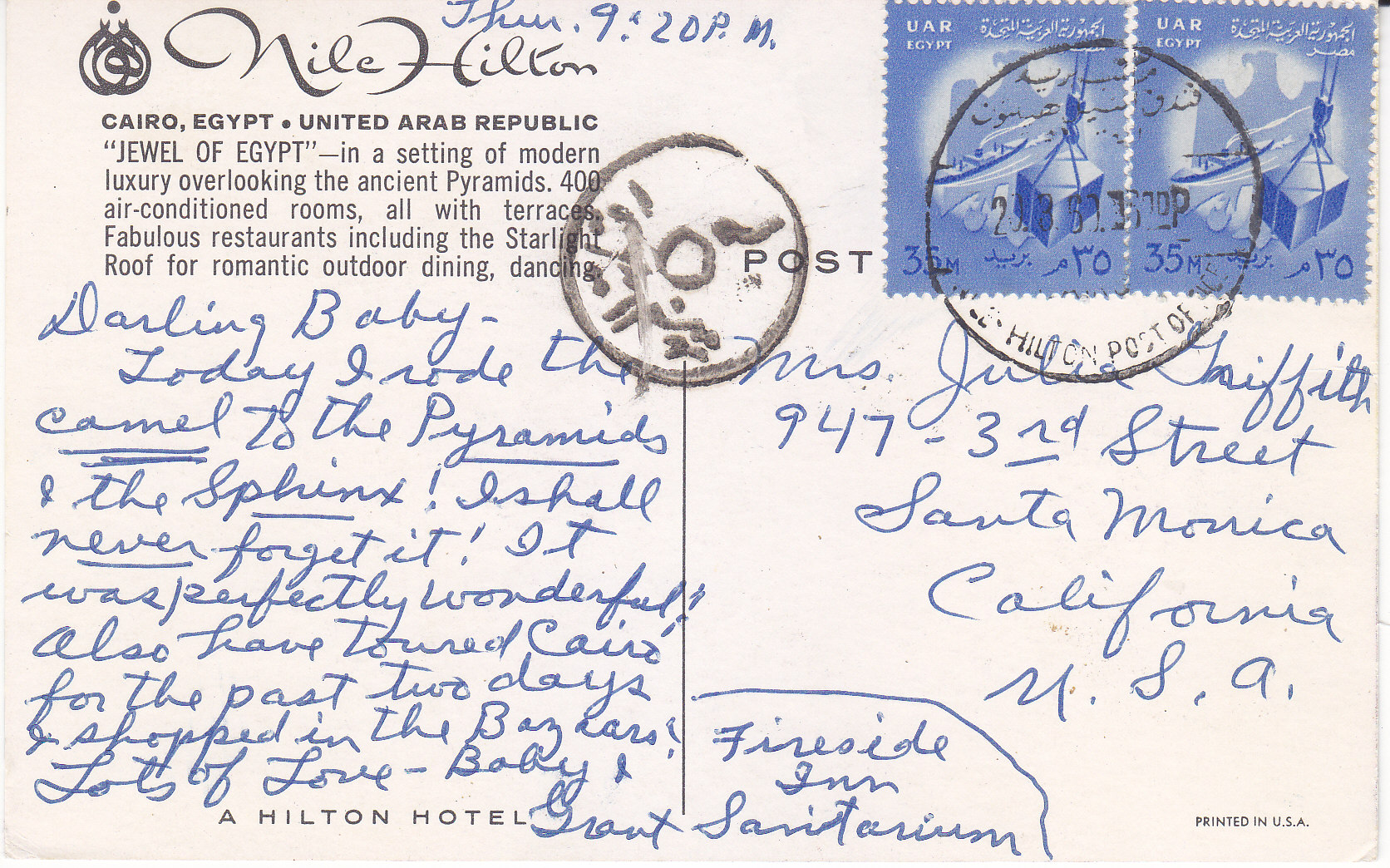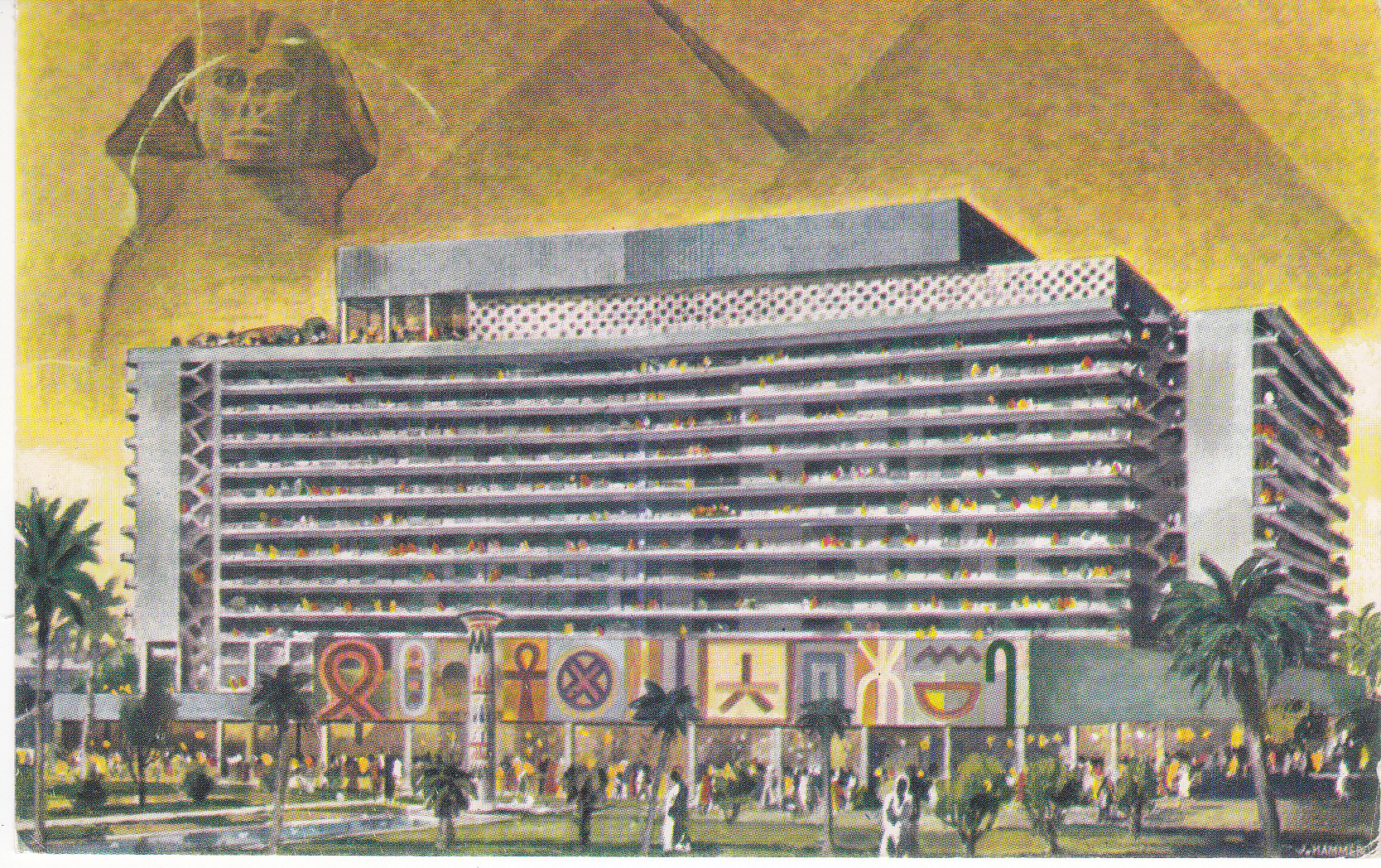 POSTCARD #423 Nile Hilton, Cairo, Egypt, United Arab Republic. Jewel of Egypt in a setting of modern luxury overlooking the ancient Pyramids, 400 air-conditioned rooms, all with terraces. Fabulous restaurants including the Starlight Roof for romantic outdoor dining, dancing. Printed in U.S.A. 5.5" x 3.5" EXC