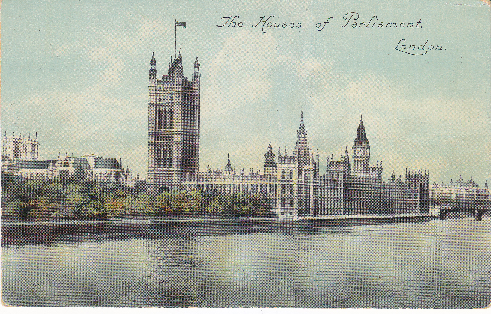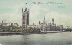 POSTCARD #454 The Houses of Parliament, London [England]. The Houses of Parliament. The famous river-front of the Houses of Parliament is 940 feet in length, and contains statues of the English Monarchs from William the Conqueror to Queen Victoria. "National" Series, M&L Ld. G&L. Trade Mark. Made in Great Britain. 5.5" x 3.5" VG