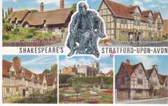 POSTCARD #292 Shakespeare's Stratford-Upon-Avon [England]. 1-26-01-52. Clockwise from top left: Anne Hathaway's Cottage; Shakespeare's Birthplace; Mary Arden's House; The Knott Garden; Hall's Croft. A Salmon Cameracolor. J.Salmon Ltd., Sevenoaks [Kent, England]. 5.5" x 3.5" GD