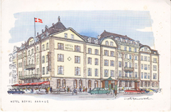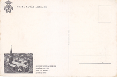 POSTCARD #355 Hotel Royal Aarhus, built 1838 [Aarhus, Denmark]. Artist: Victor Weinrich. Photo on message side of Aarhus Cathedral, built ca. 1200. JYDSK Centraltrykkeri A/S. 6.5" x 4.25" GD