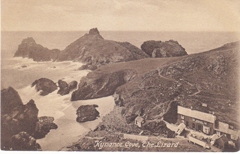 POSTCARD #401 Kynance Cove, The Lizard (with Thomas's Private Hotel in lower right corner) [Lizard Peninsula, Mounts Bay, Cornwall, England]. F. Frith & Co. Ltd. Reigate [Surrey, England]. No. 63979. Frith's Series. Printed in Saxony [Germany]. 5.5" x 3.5" EXC